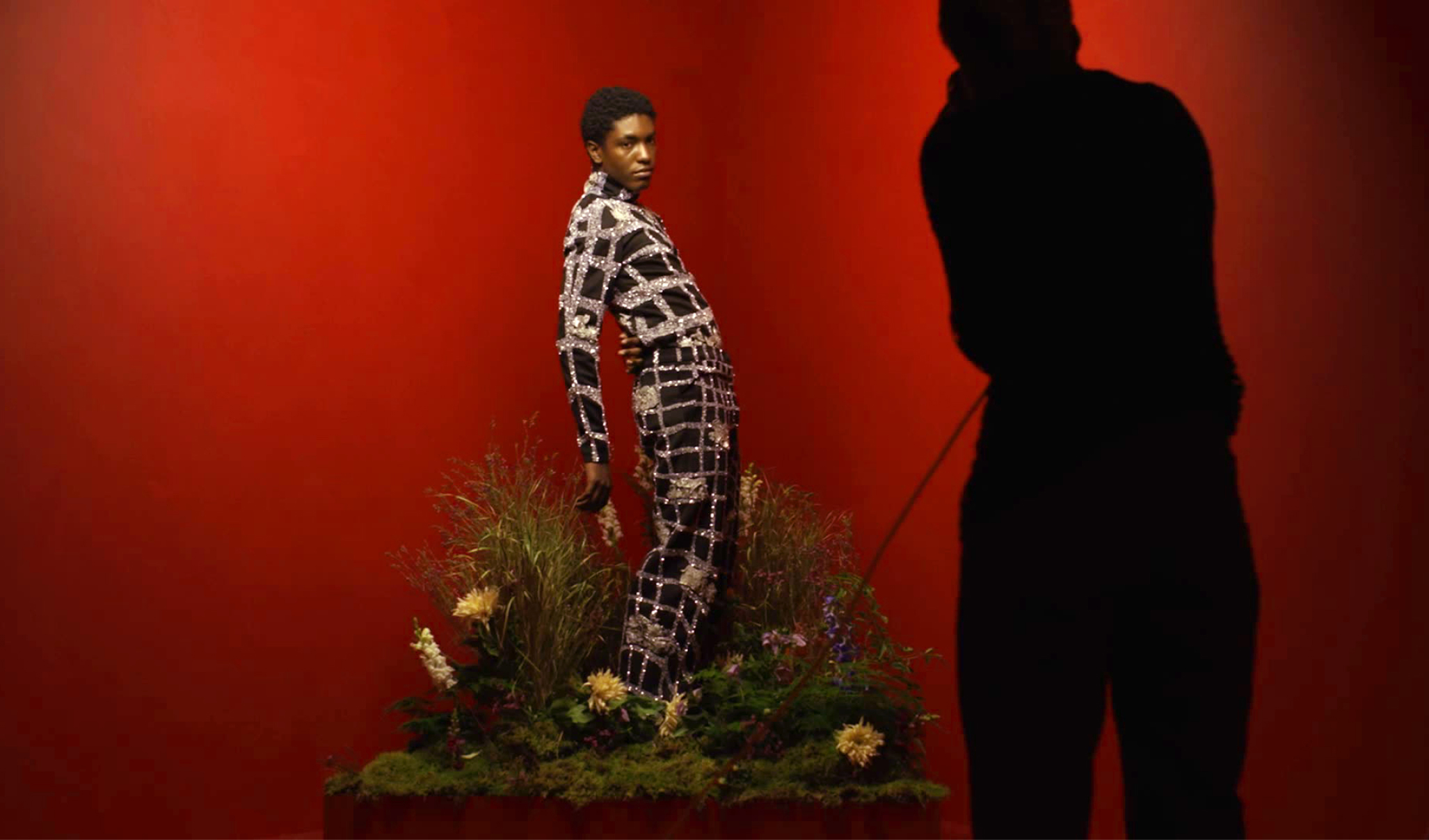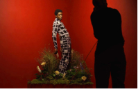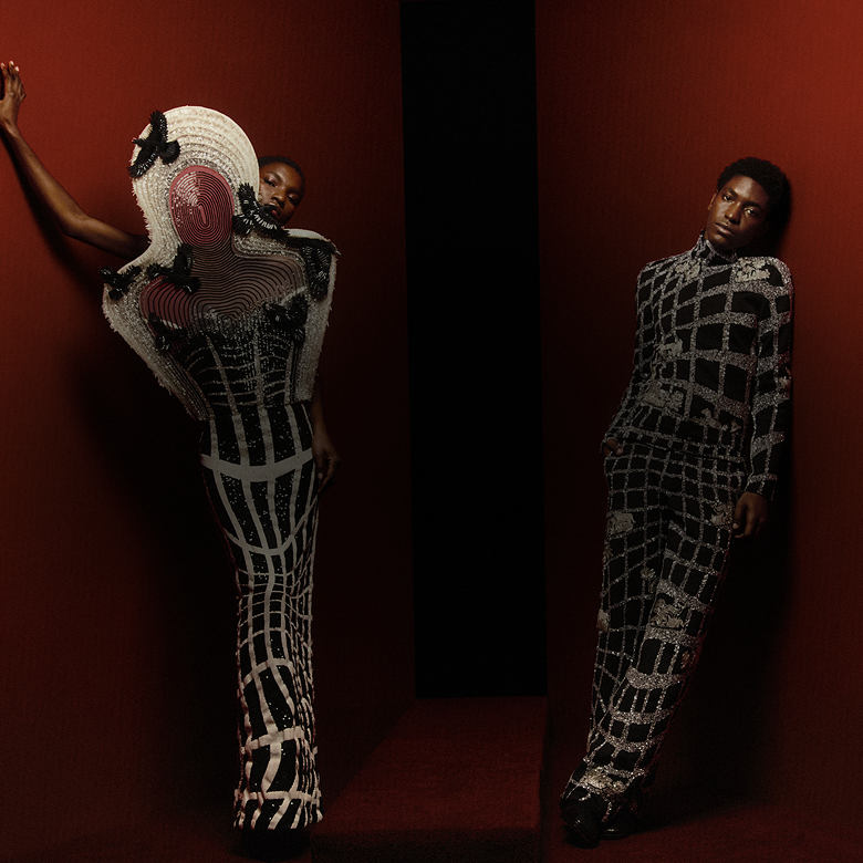 The art piece “Rhizome” explores 3D optical illusions and movement inspired by the Himalayan mountains. It harmonises the geometric forms within Bianca Saunders’ aesthetic with the organic, nature-inspired elements of Rahul Mishra’s couture work.